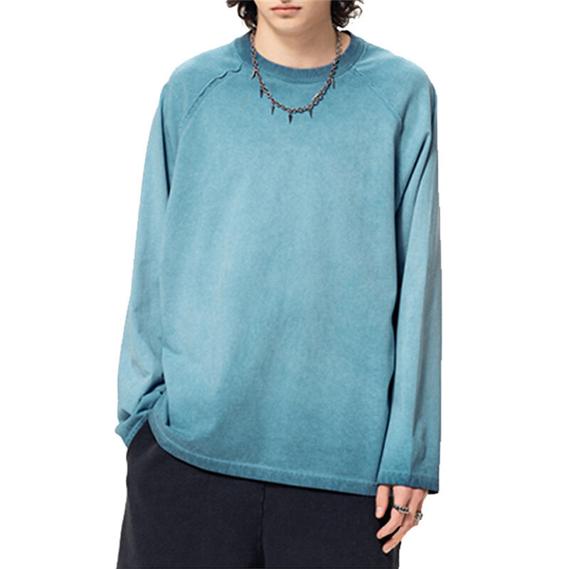 New arrival men's long sleeve tee crafted from 270GSM heavyweight 100% cotton. Features garment-washed softness, unique reverse garment-dyed & acid-wash finish, and trendy macaron colors for premium street style.