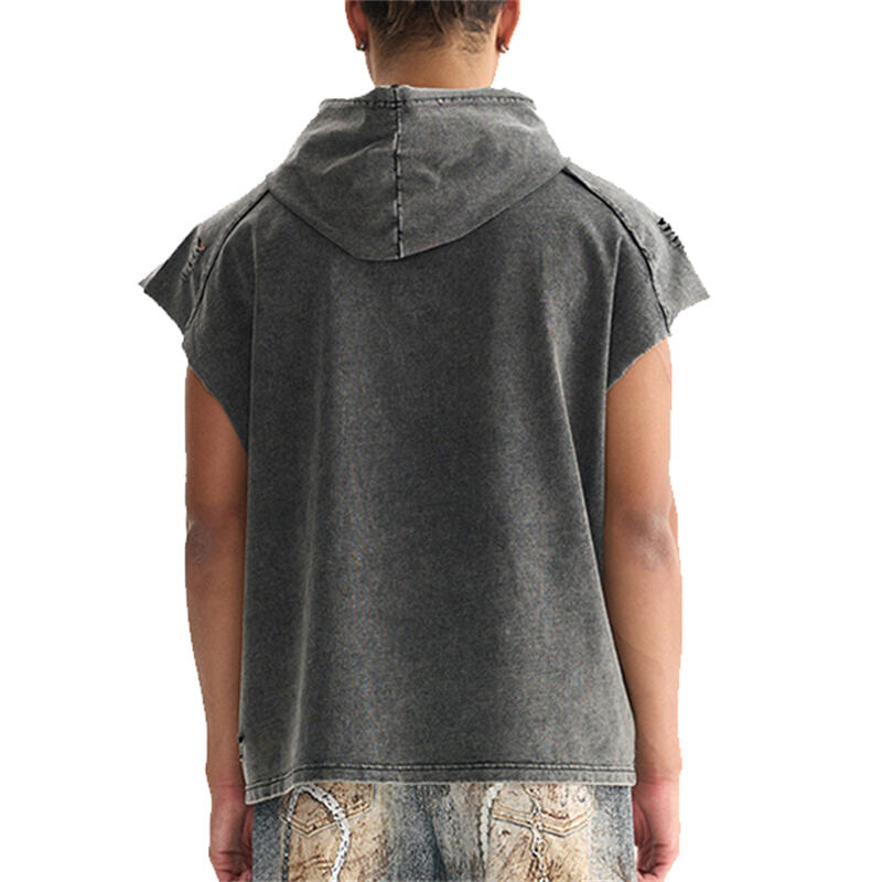 Premium men's hooded sleeveless vest with American vintage style. Features streetwear-inspired paneled color block and trendy distressed ripped details, perfect for casual street styling.